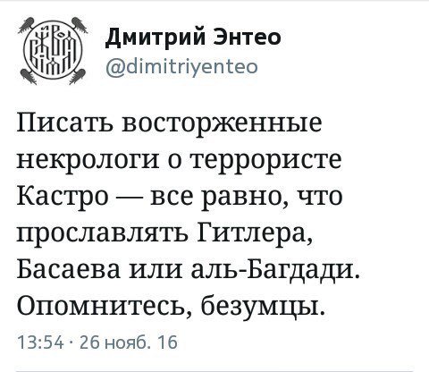 Date: 2016-11-27 03:36 pm (UTC)Трамп назвал Фиделя Кастро "жестоким диктатором"