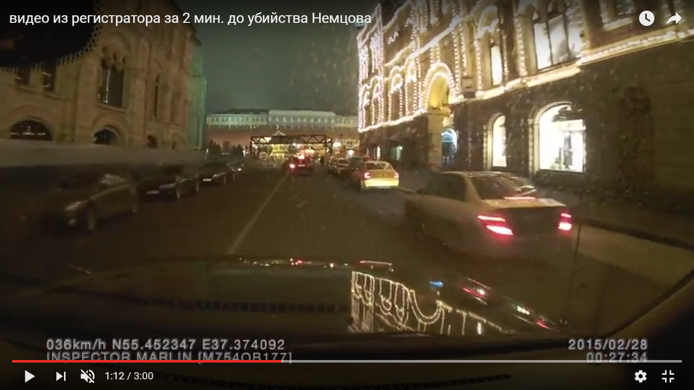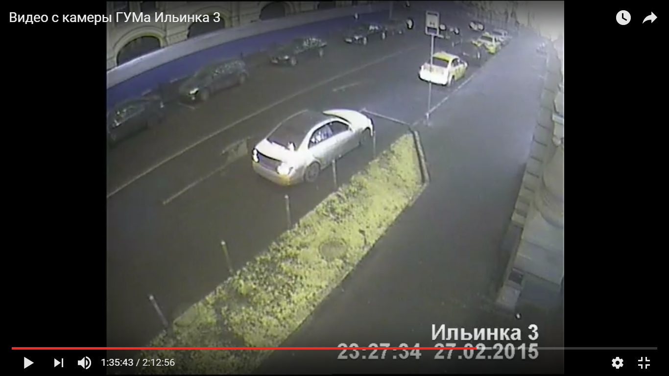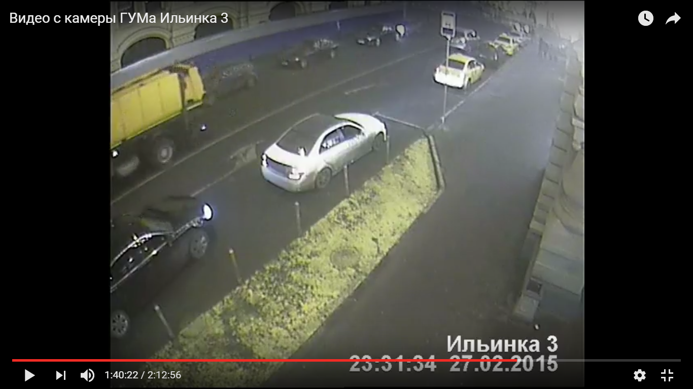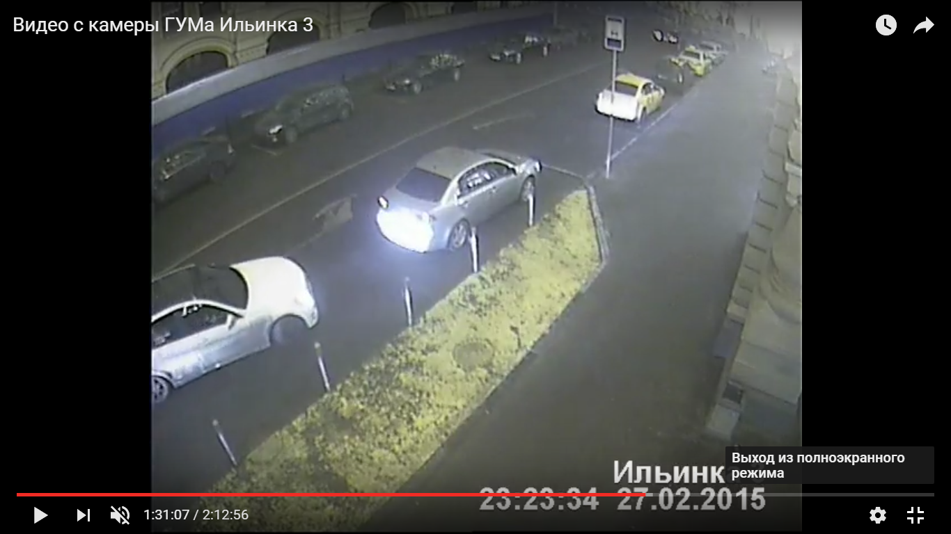Время на видеозаписи 23.31.13, в этот момент пара Немцов-Дурицкая скрывается за тенью мусороуборочной машины. Практически параллельно в тот же момент, мимо проезжает последняя легковая машина, в которой теоретически мог быть регистратор.