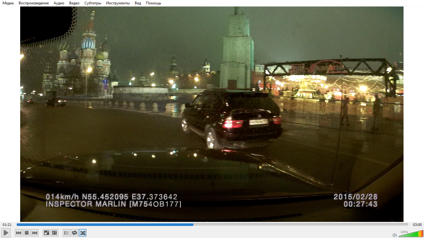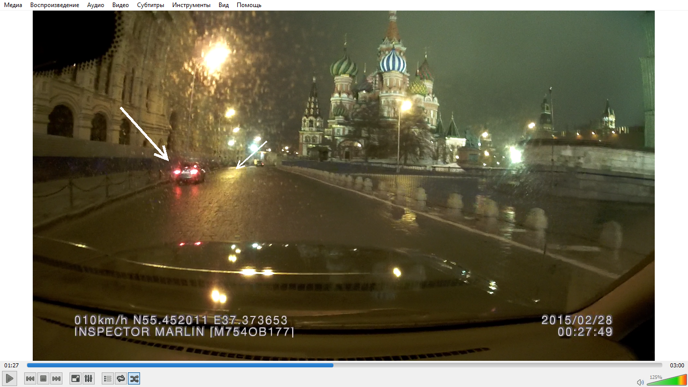 в момент выезда его на Красную площадь. Смотрим время на записи регистратора 00:27:43 (часы установлены на час вперед, истинное время регистратора 23:27:43)