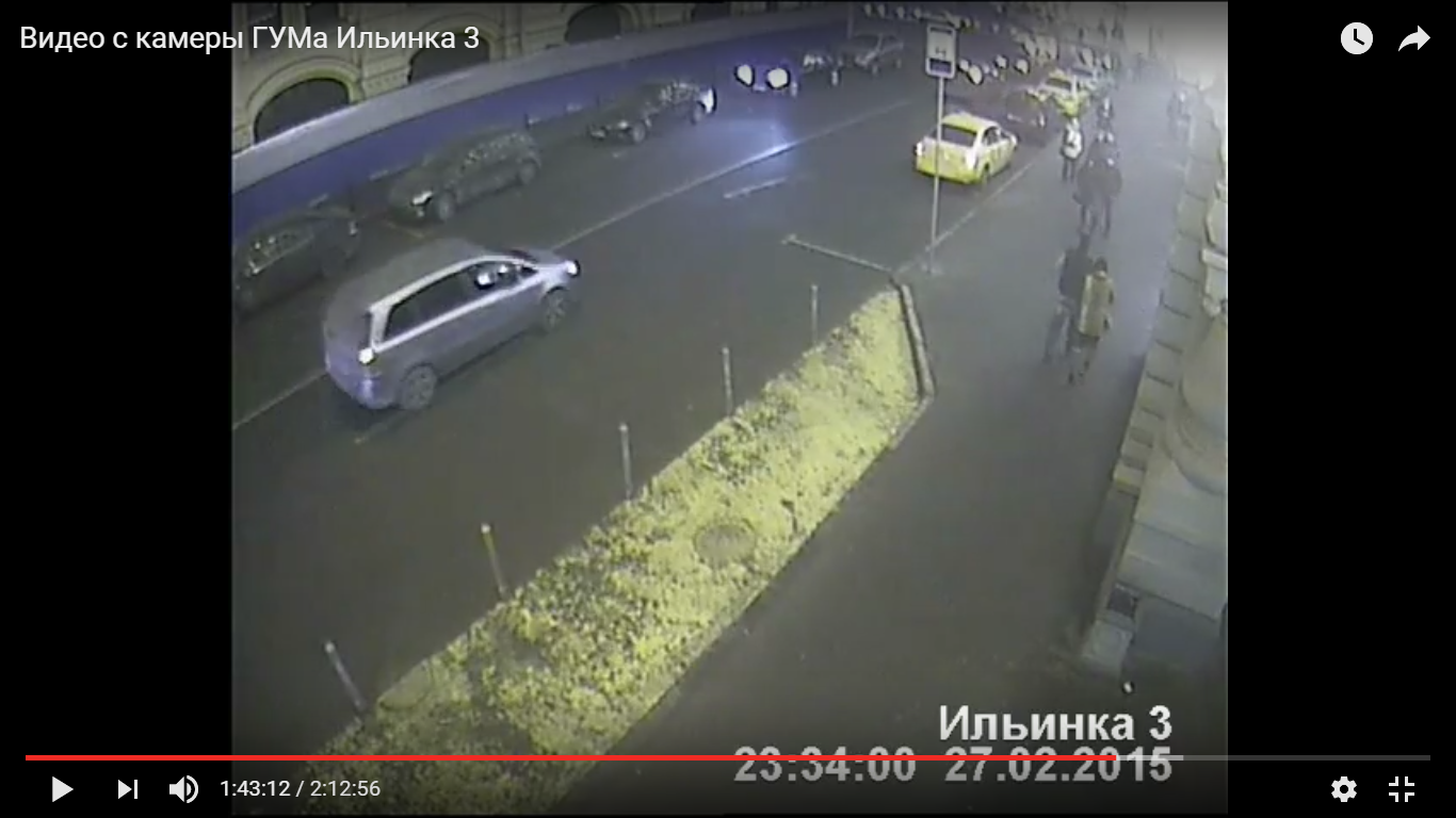 В той самой, где в 22:38 видели каких-то двух слоняющихся дебилов, которые якобы следили за Немцовым, а то, что там происходило за две минуты до убийства — это, извините, никому не интересно. Или не так, правильнее сказать очень интересно и мы все видели и мы все знаем, но... но только никому об этом не расскажем и тайну унесем с собою в могилу. Ведь так Вадим Юрьевич? Два года вы с Жанной Борисовной грандиозно валяли дурачка, а то, что у вас под носом было, ну в упор не замечали. Но только на что вы надеялись? Что пронесет и тайное никогда не станет явным? Но тогда не повезло вам, что материалы оказались у меня. И я продолжаю.