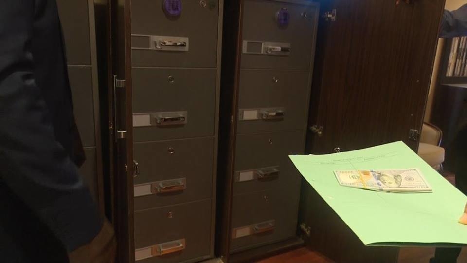 Получив судебный ордер, силовики выломали дверь четырёхкомнатной квартиры на седьмом этаже здания. Внутри они обнаружили три несгораемых шкафа, заполненных аккуратно упакованными пачками валюты. В общей сложности правоохранители изъяли 43 миллиона долларов США, более 27 тысяч фунтов стерлингов и более 23 миллионов нигерийских найр.