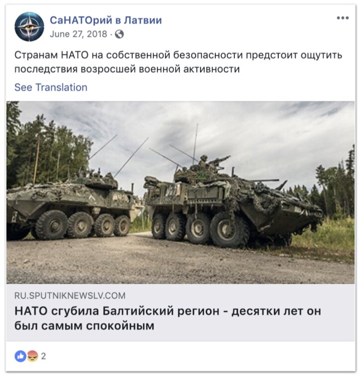 Facebook удалил более 500 страниц, связанных с Россией — среди них 289 страниц и 75 аккаунтов, которыми, по утверждению соцсети, управляли сотрудники российского государственного информагентства Sputnik. Эти страницы маскировались под независимые новостные издания и предназначались для граждан стран Центральной и Восточной Европы, Прибалтики, Кавказа и Центральной Азии. Администраторы страниц координировали свои действия и вводили пользователей в заблуждение. Они публиковали, в частности, материалы на темы «антинатовских настроений, протестных движений и коррупции», говорится в заявлении Facebook.