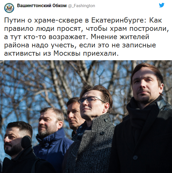Лидер группы «Чайф» Владимир Шахрин, который считается одним из лидеров мнений в Екатеринбурге, отказался хоть как-то высказываться о главном конфликте города — битве за сквер. До этого музыкант несколько раз откровенно говорил о том, что выступает за строительство храма, а когда начались протесты в городе, сказал, что жители Екатеринбурга стали жертвой манипуляторов.