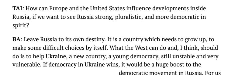 Взял у меня недавно интервью (на английском) один американский журнал, который среди прочего спросил: как Европа и США могут помочь России стать сильной, плюралистичной, демократической страной? Я ответил: никак. Предоставьте Россию собственной судьбе. Это страна, которой предстоит самой расти и принимать трудные решения. Лучше помогите Украине.