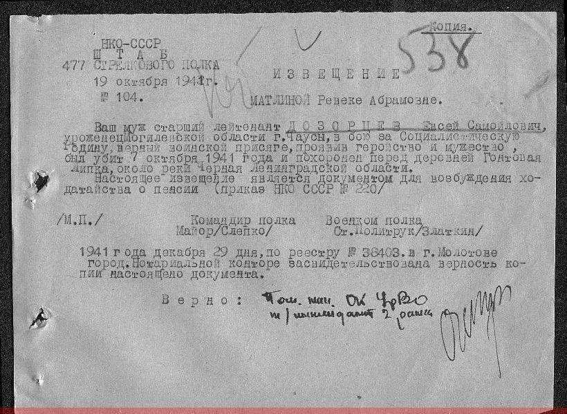…Мой дед, старший лейтенант Евсей Дозорцев, погиб 7 октября 1941 года у Черной речки, под Ленинградом, в результате прорыва немцами обороны неподалеку от деревни Гонтовая Липка. Вместе с ним в тот день погибли многие бойцы 2-й минометной роты 477 гвардейского полка, но фамилий погибших в рапорте о произошедшем нет.