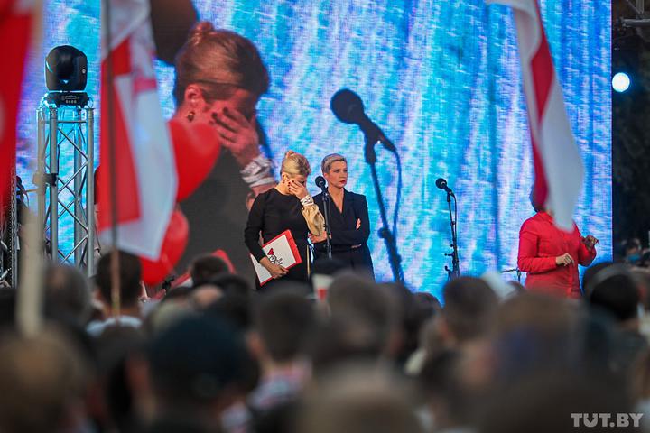 Кандидат в президенты Светлана Тихановская начала выступление на белорусском языке, потом перешла на русский. Она в очередной раз заявила о том, что идет в президенты ради своего мужа и белорусов — и ее главные цели в освобождении политзаключенных, проведении новых честных выборов и референдуме о возвращении к Конституции 1994 года.