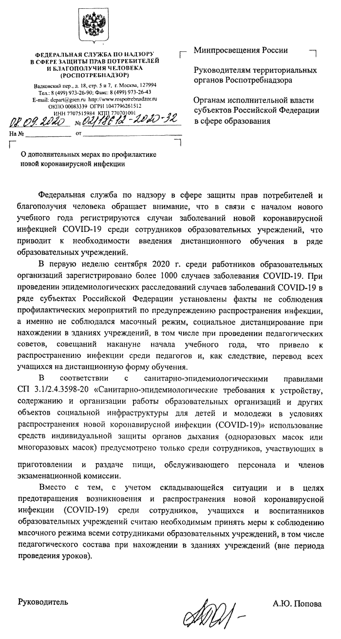Вину за это Попова возложила на самих преподавателей, которые, как показали расследования санврачей, не носили маски и пренебрегали мерами социального дистанцирования, «в том числе при проведении педагогических советов, совещаний накануне начала учебного года, что привело к распространению инфекции среди педагогов».