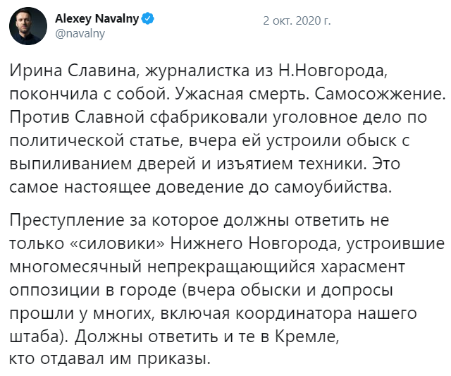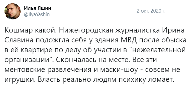 Профсоюз журналистов потребовал провести расследование смерти главреда KozaPress Ирины Славиной, совершившей акт самосожжения около здания МВД в Нижнем Новгороде.https://t.co/4uh5J8QNO5