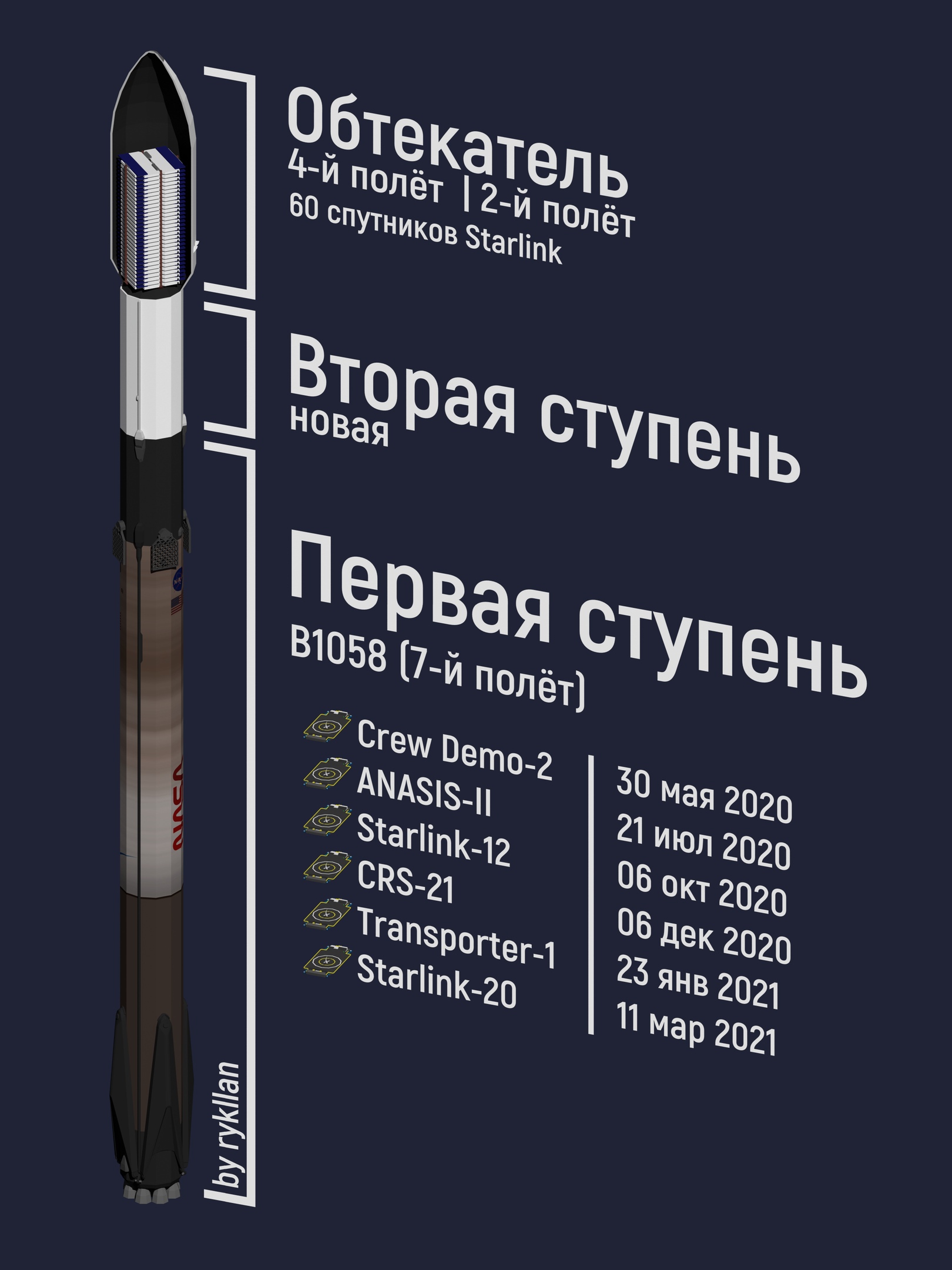 Это уже 24-й вывод на орбиту группы интернет-спутников начиная с мая 2019 года в рамках проекта Starlink и девятый запуск ракеты-носителя Falcon 9 в текущем году. Орбитальная группировка SpaceX уже состоит из 1383 космических аппаратов. Предыдущая партия из 60 спутников Starlink была запущена 24 марта.