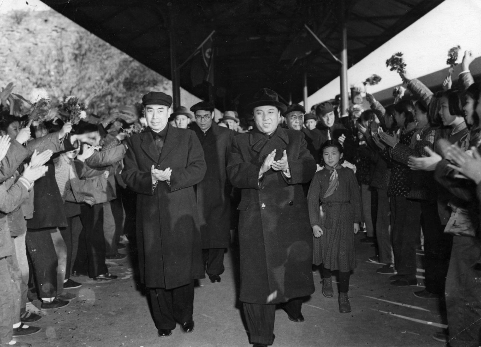Чжоу (слева) с лидером Северной Кореи Ким Ир Сеном на железнодорожной станции в Пекине в ноябре 1953 года.