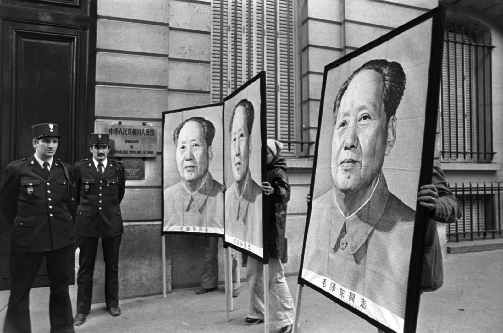 Люди держат портреты Мао перед посольством Китая в Париже после его смерти 9 сентября 1976 года. Ему было 82 года.
